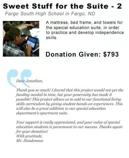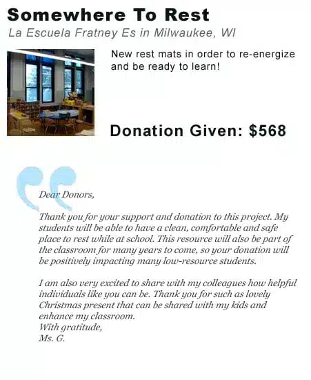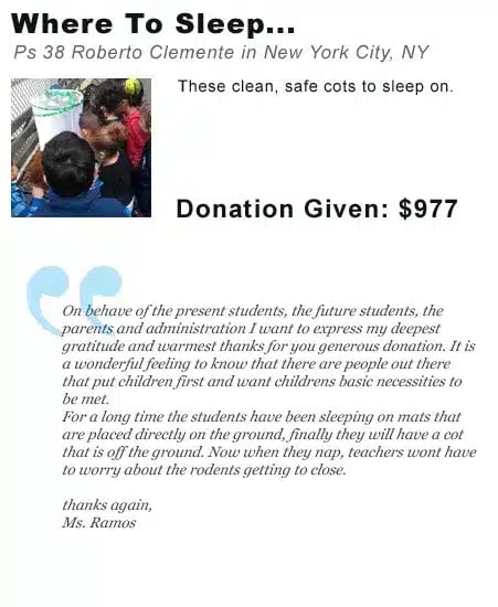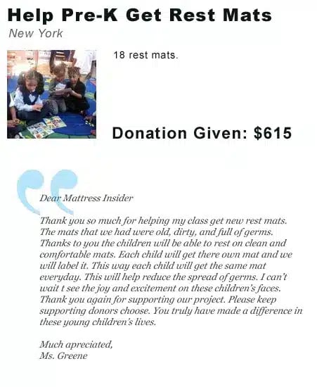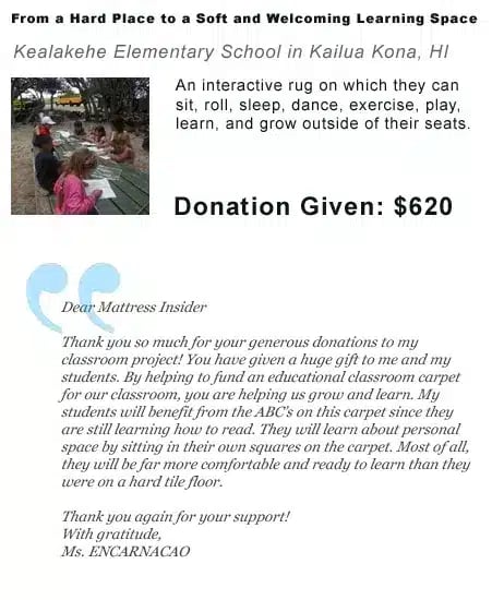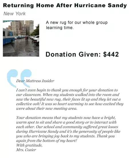 Mattress Insider is proud to donate directly to schools and classrooms in need of assistance for disaster recovery, or worthy projects and supplies for kids in high poverty areas.