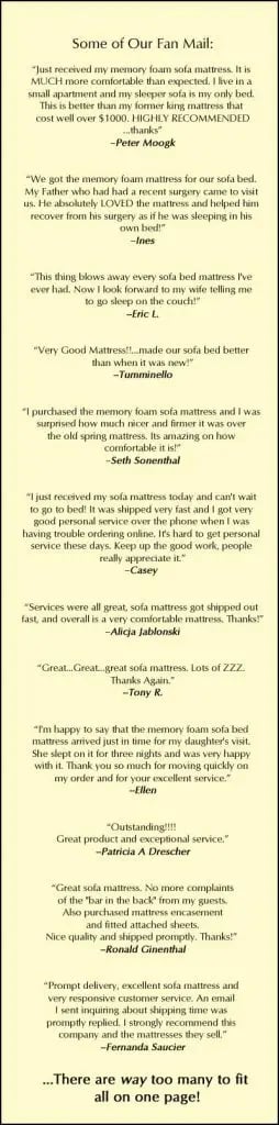 Make sure to double check your measurements because we start making your custom sofa mattress almost immediately. Due to the cost of materials and labor, by placing your order, you understand that there are no cancellations, modifications, returns, or refunds. If you have any questions or you need help placing your custom order, please don’t hesitate to call 888-488-1468.