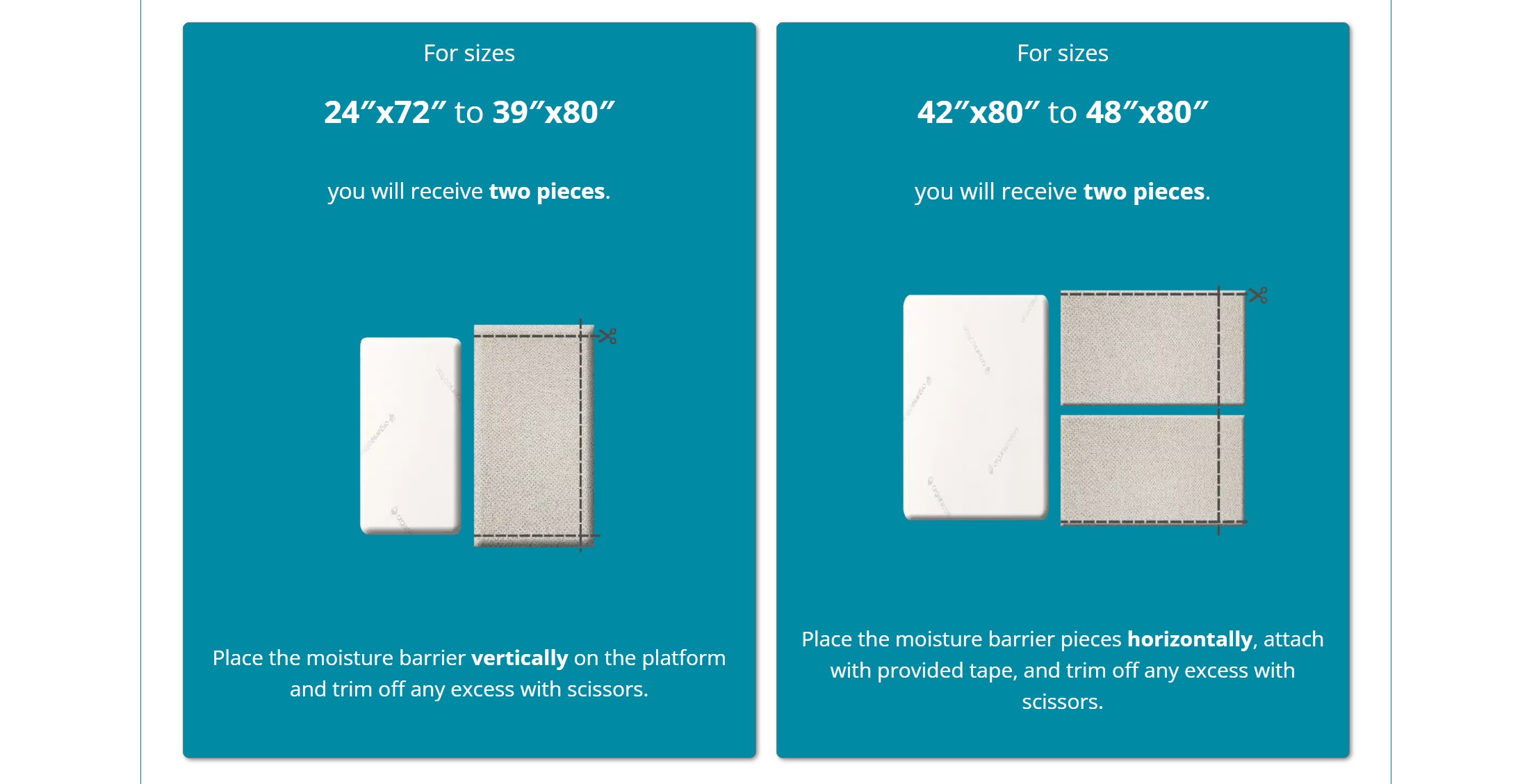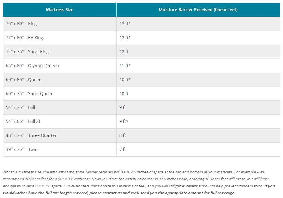 *for this mattress size, the amount of moisture barrier received will leave 2.5 inches of space at the top and bottom of your mattress. For example – we recommend 10 linear feet for a 60″ x 80″ mattress. However, since the moisture barrier is 37.5 inches wide, ordering 10 linear feet will mean you will have enough to cover a 60″ x 75″ space. Our customers don’t notice this in terms of feel, and you will still get excellent airflow to help prevent condensation. If you would rather have the full 80″ length covered, please contact us and we’ll send you the appropriate amount for full coverage.